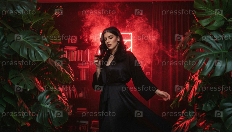 Брюнетка в черном халате танцует с бокалом в комнате с красным неоновым освещением