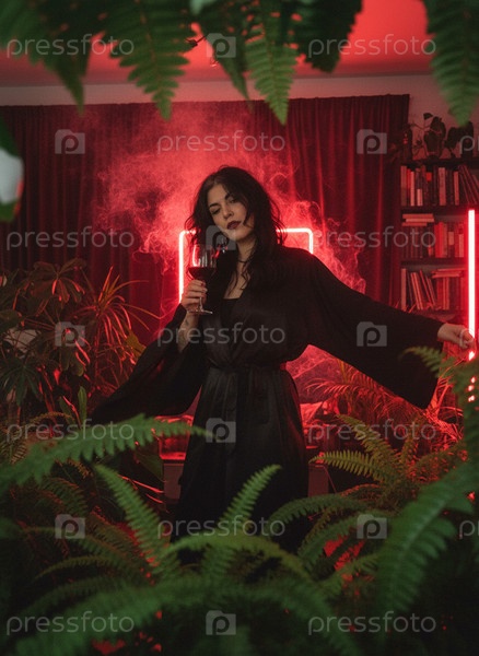 Брюнетка в черном халате танцует с бокалом в комнате с красным неоновым освещением