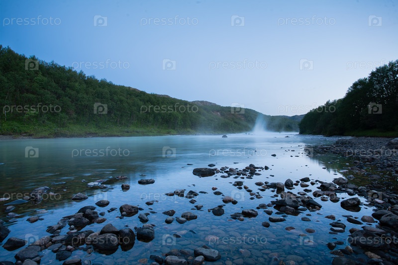 Ночная река Титовка среди лесистых берегов и каменистого русла