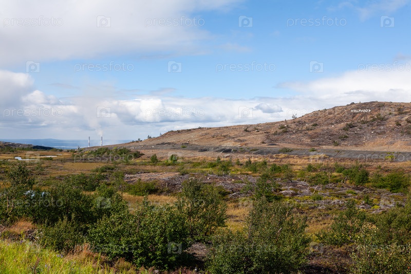 Панорама холмов с надписью Hollywood на Кольском полуострове