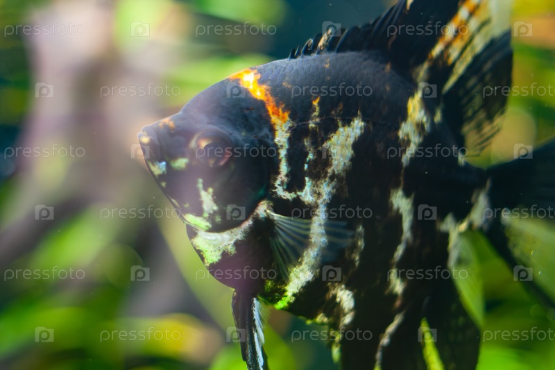 Черная скалярия кои в аквариуме крупным планом тропическая рыба