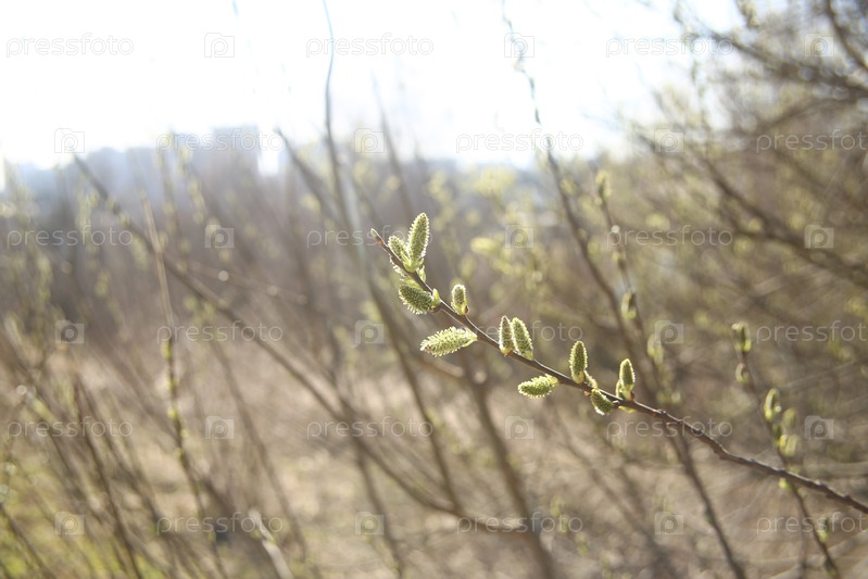 Зеленое растение на ветке в весенней атмосфере крупным планом