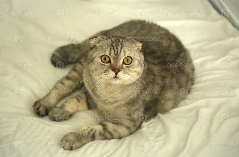 Серый милый вислоухий британец кот лежит на кровати и смотрит в камеру