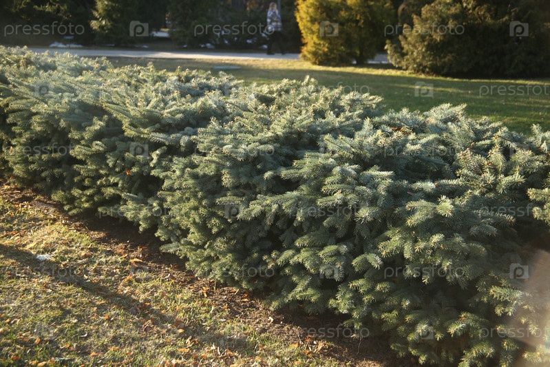 Весенний пейзаж с деревьями, растениями елью соснами и тропинкой в парке