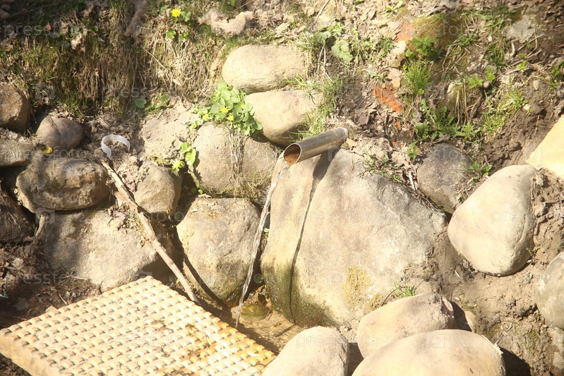 Весенний пейзаж с растениями, травой, ручьем и струей воды крупным планом