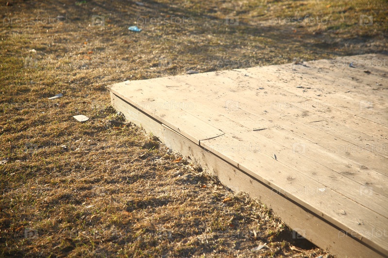Весенний пейзаж с деревьями, растениями, землей на улице и деревянная пристройка