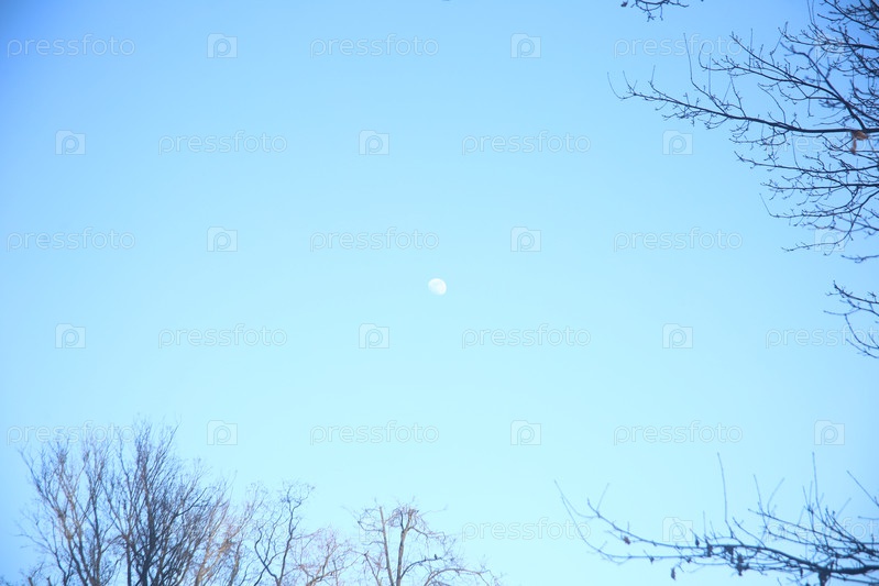 Весенний пейзаж с деревьями, растениями и луной на синем небе