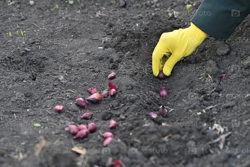 Садовник в желтой перчатке сажает красные луковичные луковицы на богатой почве весной.Основное внимание уделяется тщательной посадке, чтобы обеспечить сильный рост и урожай