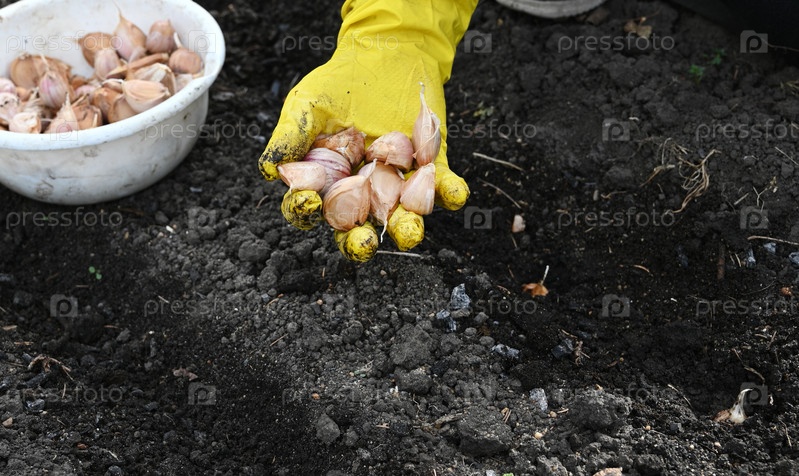 Садовник сажает гвоздики чеснока в почву в солнечный весенний день