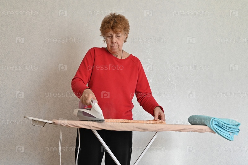 Женщина гладит голубое полотенце на доске для глажения в домашней обстановке днем