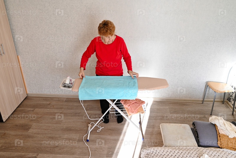 Женщина гладит голубое полотенце на доске для глажения в домашней обстановке днем
