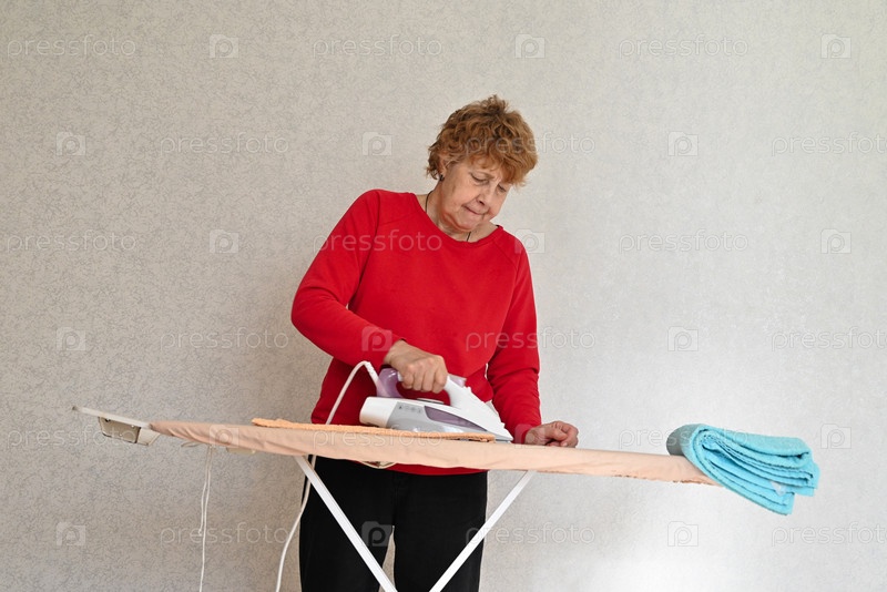 Серая женщина среднего возраста, разговаривающая со своим смартфоном, гладит одежду в прачечной