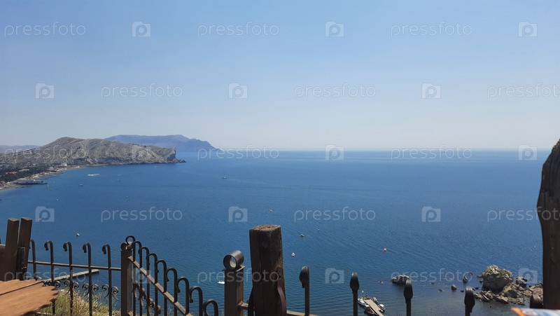 Панорамный вид на побережье Судака и Черное море с высоты. В кадре видны скалистые берега, бухта и морская гладь. Снимок сделан в ясный летний день с обзорной точки у Генуэзской крепости