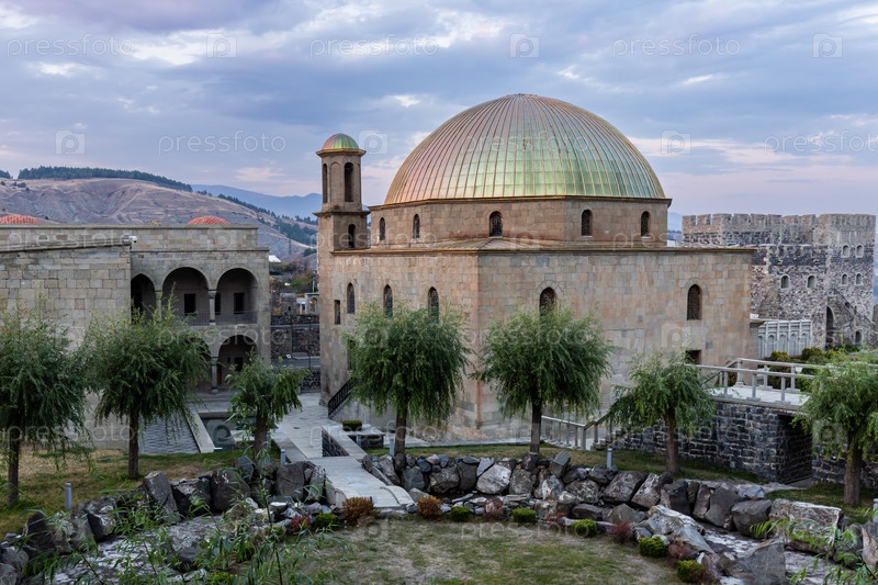 Вид на мечеть Султана Ахмада против гор и заката неба, также известный как Мечеть Ахмедия, расположенная в историческом комплексе замка Рабати в городе Ахалцихе, Грузия