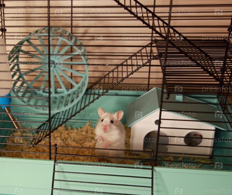 Белый хомячок в клетке с домиком