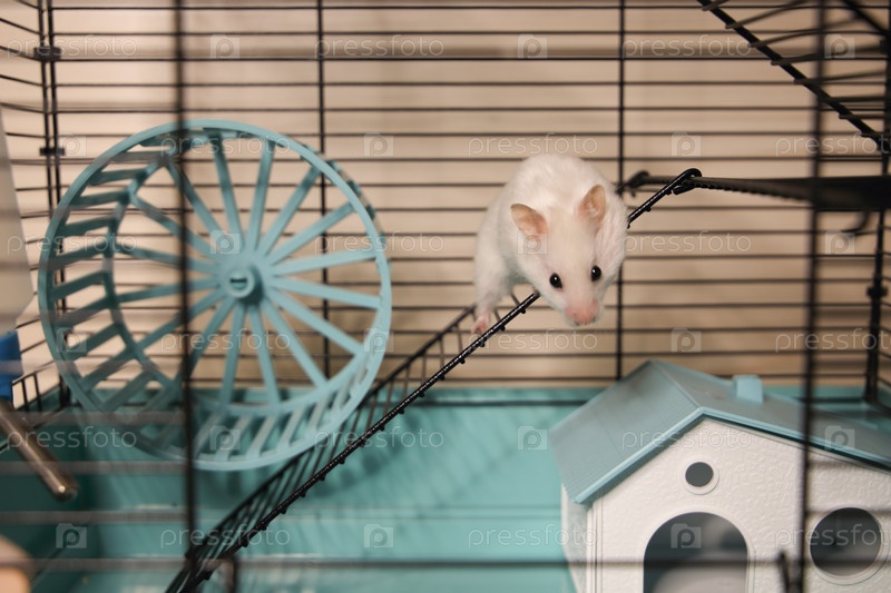 Белый хомячок в клетке с домиком