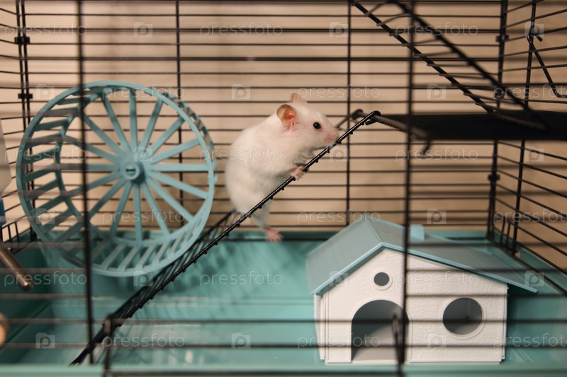 Белый хомячок в клетке с домиком