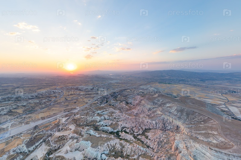 Широкий воздушный вид сложной системы каньонов Красной долины с большой высоты, со ярким закатом солнца, освещающего эродированные склоны и извилистые дно долины