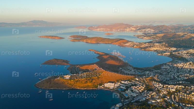 Утренняя аэропанорама береговой линии с белыми домами, яхтами в заливе и зелеными холмами под ярким утренним солнечным светом.. Aerial View