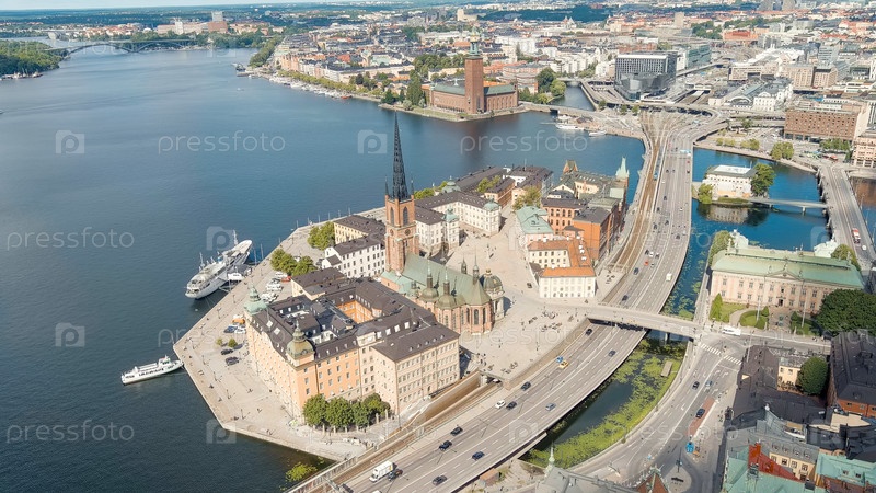 Стокгольм, Швеция. Остров Риддархольмен и озеро Маларен. Церковь Риддархольмена. Панорама города. Летний день, Aerial View
