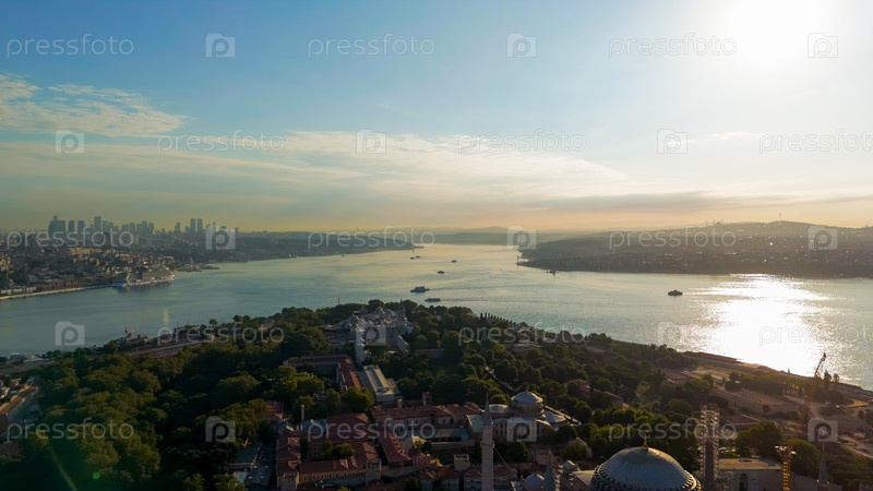 Панорамный вид Босфорского пролива и Золотого Рога с кораблями, мостами и горизонтом города под голубым утренним небом