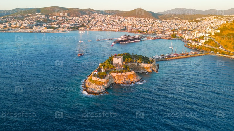 Кусадаси, Турция. живописный вид с воздуха на остров Голубей и его замок при закате солнца. знаковая достопримечательность соединена мостом под золотистым вечерним небом.. Aerial View