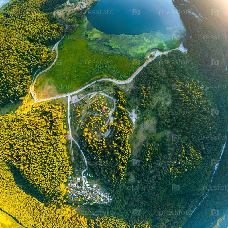 Абант - большое пресноводное озеро, окруженное горами и лесом с живописным видом. Время захода солнца. Летний пейзаж. Главный снимок. Вид из воздуха