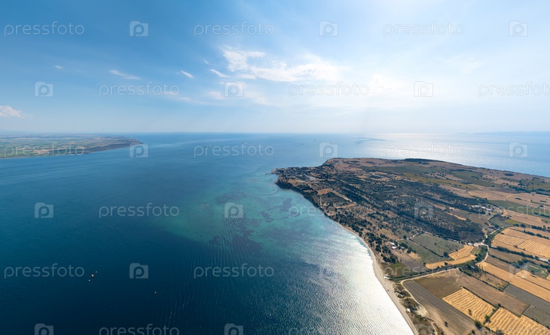 Панорамный взгляд из воздуха на Дарданелльский пролив с кораблями, залив Эртугрула, крепость Седулбахир, французское кладбище и Кумкале на противоположном берегу