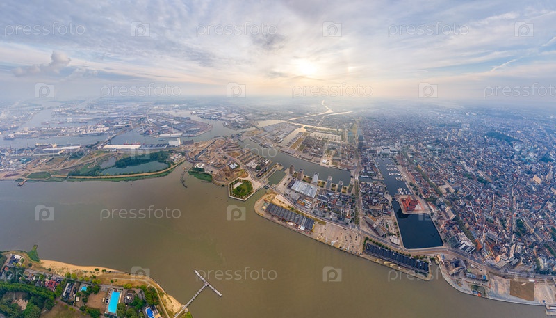 Антверпен, Бельгия. Панорама города. Река Шелда (Эскаут). Летнее утро. Вид с воздуха