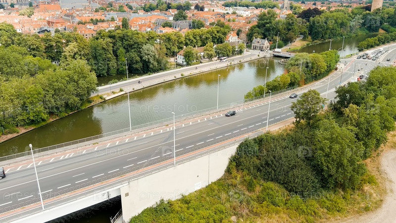 Брюгге, Бельгия. Katelijnepoort - Swing bridge. Kanaal Gent-Brugge. Панорама города с воздуха. Облачная погода, летний день, Aerial View