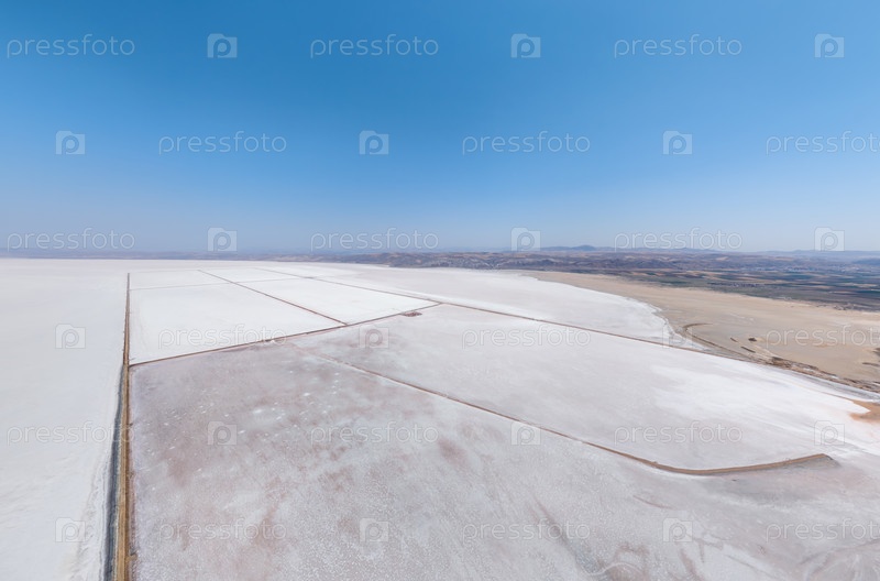 Обнажающая панорама с воздуха блестящей белой соляной равнины Туз-Голо, темные следы транспортных средств создают геометрические линии через кристаллическую поверхность в сторону горизонта под ярким солнцем