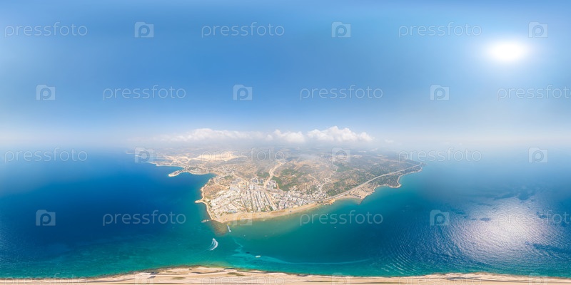 Полный сферический панорамный вид с высоты острова Девичьего замка, показывающий Средиземное море, пляжи, прибрежный город и горы Телец. Панорама 360x180