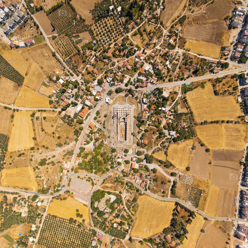 Дидим, Турция. вид планирования городского и сельскохозяйственного землепользования, показывающий интеграцию древнего участка с современными полями и жилой застройкой