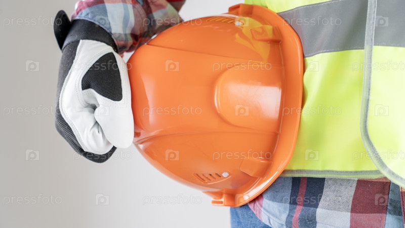 Работник держит оранжевую жесткую шляпу в перчаточной руке