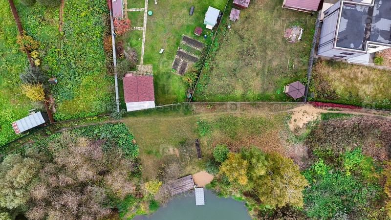 Дом за пределами города рядом с озером. Небольшой пирс возле пруда. Участок земли огражден, вид сверху. Частная собственность на землю около воды