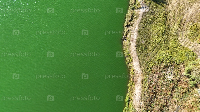 Вид с воздуха показывает чистую бирюзовую воду рядом с моховой скалой