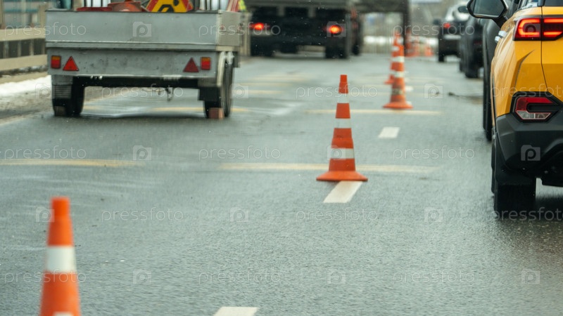 Оранжевые конусы охраняют влажную городскую дорогу