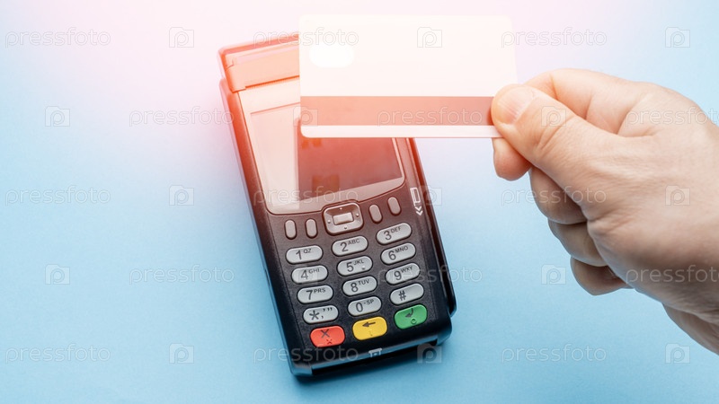 Близкий снимок ручного размещения кредитной карты в платежном терминале