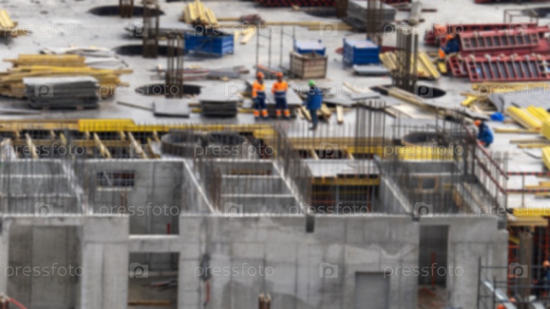 Строительство монолитного жилого здания крупный план. строительная площадка. монтажные работы. недвижимость. строители стоят на плите пола строящегося дома, вид сверху. строительство