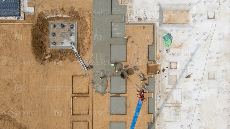 Процесс закладки фундамента для нового здания, рассматриваемый сверху, включает в себя налив бетона для основания.Рабочие на строительной площадке, рассматриваемые сверху, используют конструкцию