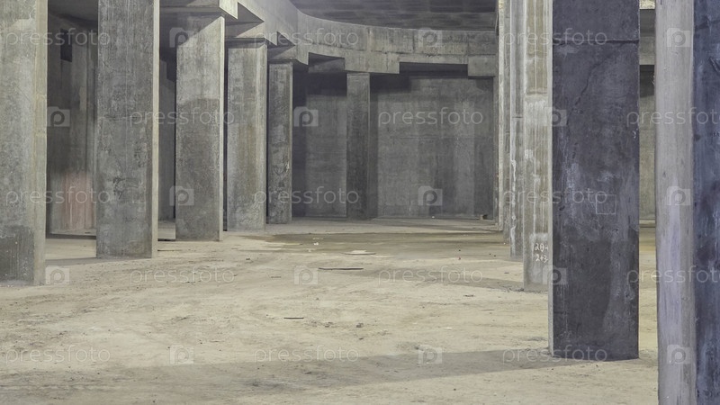 Подвал с огромными бетонными колоннами и искусственным освещением незавершенного дома