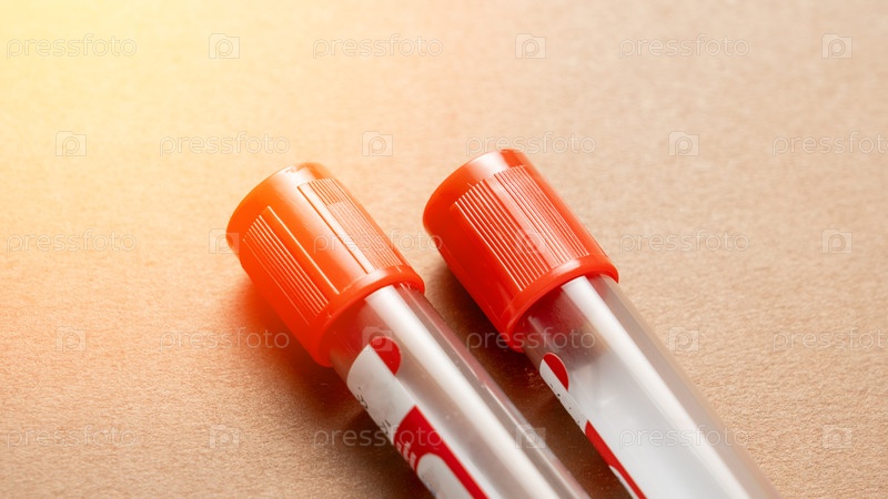 Две трубки для сбора крови с оранжевыми колпачками лежат на текстурированной поверхности