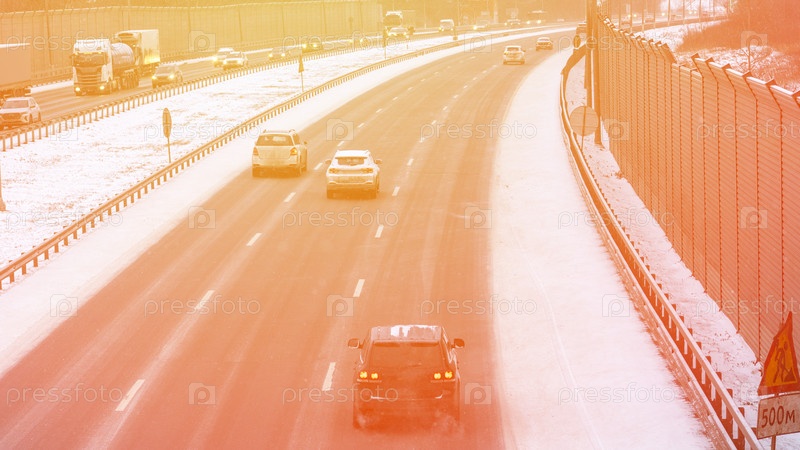 Автомобили на зимней автомагистрали поворачивают направо, вдоль дороги белые снежные машины едут с высокой скоростью по ледяной трассе