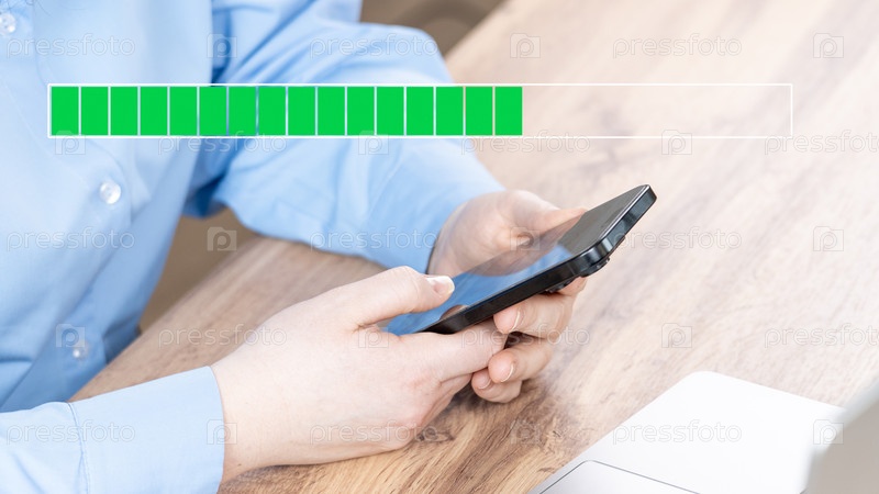 Женщина, держащая телефон, в окружении ноутбука с инфографикой на переднем плане, загружает документы и передает данные из телефона на ноутбук