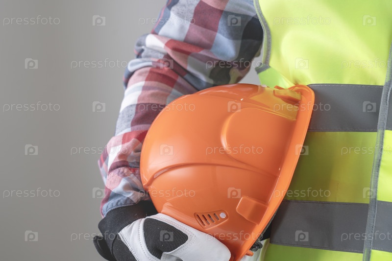 Близкий план мужчины в оранжевом строительном шлеме