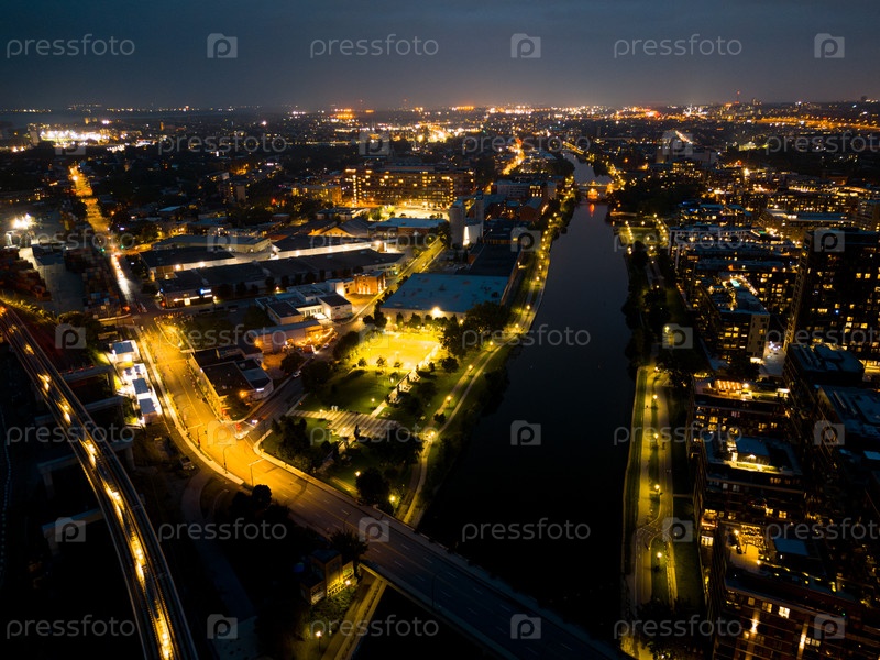 Горизонт Монреаля, освещенный при закате и отражающийся в воде, Квебек, Канада