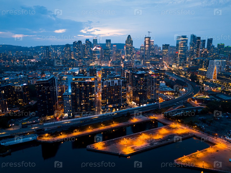Горизонт Монреаля, освещенный при закате и отражающийся в воде, Квебек, Канада