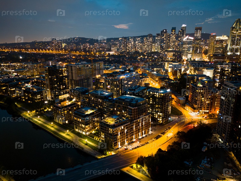 Горизонт Монреаля, освещенный при закате и отражающийся в воде, Квебек, Канада