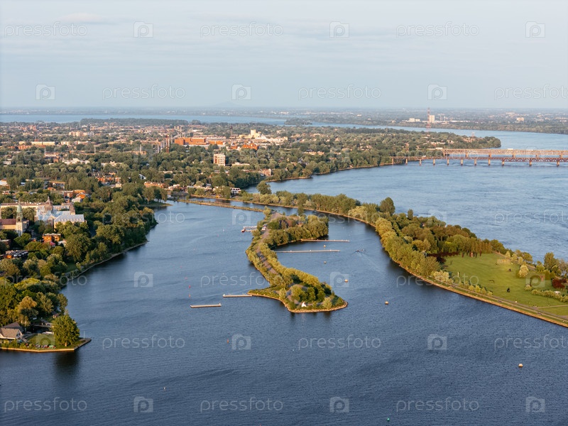 Вид с воздуха на полуостров маяка Rene-Levesque Park в Lachine, Монреаль вдоль реки Святого Лоуренса при закате солнца. g