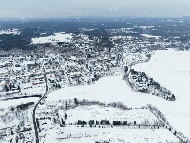 Зимний вид из воздуха города Ватерлоо с замерзшим озером, кладбищем, снежными домами и дорогами в Квебеке, Канада. g